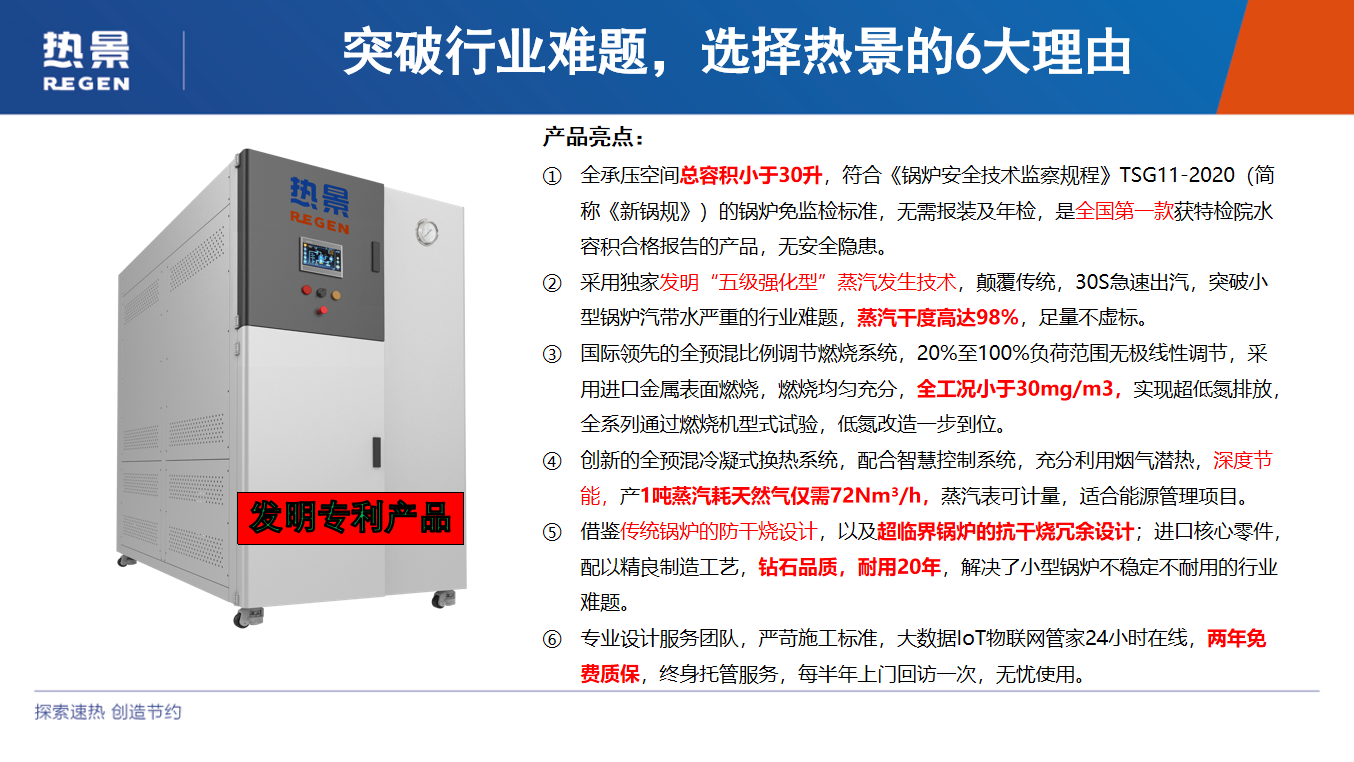 江西热景锅炉有限公司作为智慧热能解决方案服务商,依托23项核心专利技术,打造的全预混冷凝式免监检蒸汽发送器,在解决这些行业痛点方面表现卓越。其严格遵循《锅炉安全技术监察规程》TSG11 - 2020标准,将全承压空间总容积精准控制在30升以内,获国家特检院水容积合格报告,无需报装、无需年检、无需配备专职司炉工,从源头规避了合规风险。搭载全预混冷凝式换热系统,高效回收烟气潜热,排烟温度低至60℃,热效率优异,产1吨蒸汽仅消耗天然气72Nm³,较传统设备节能显著。采用发明专利五级强化型蒸汽发生技术,30秒即可快速出汽,蒸汽干度达98%,且可实现万小时稳定运行无波动,使用寿命可达20年。